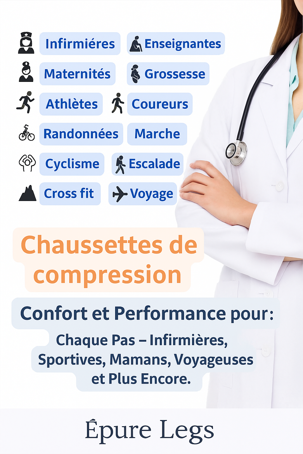 Oui ! Les chaussettes Épure Legs utilisent une compression graduée, reconnue médicalement pour stimuler la circulation, réduire la fatigue musculaire, soulager les jambes lourdes, et prévenir les gonflements. Nos clientes (infirmières, sportives, voyageuses…) ressentent un soulagement dès la première utilisation.